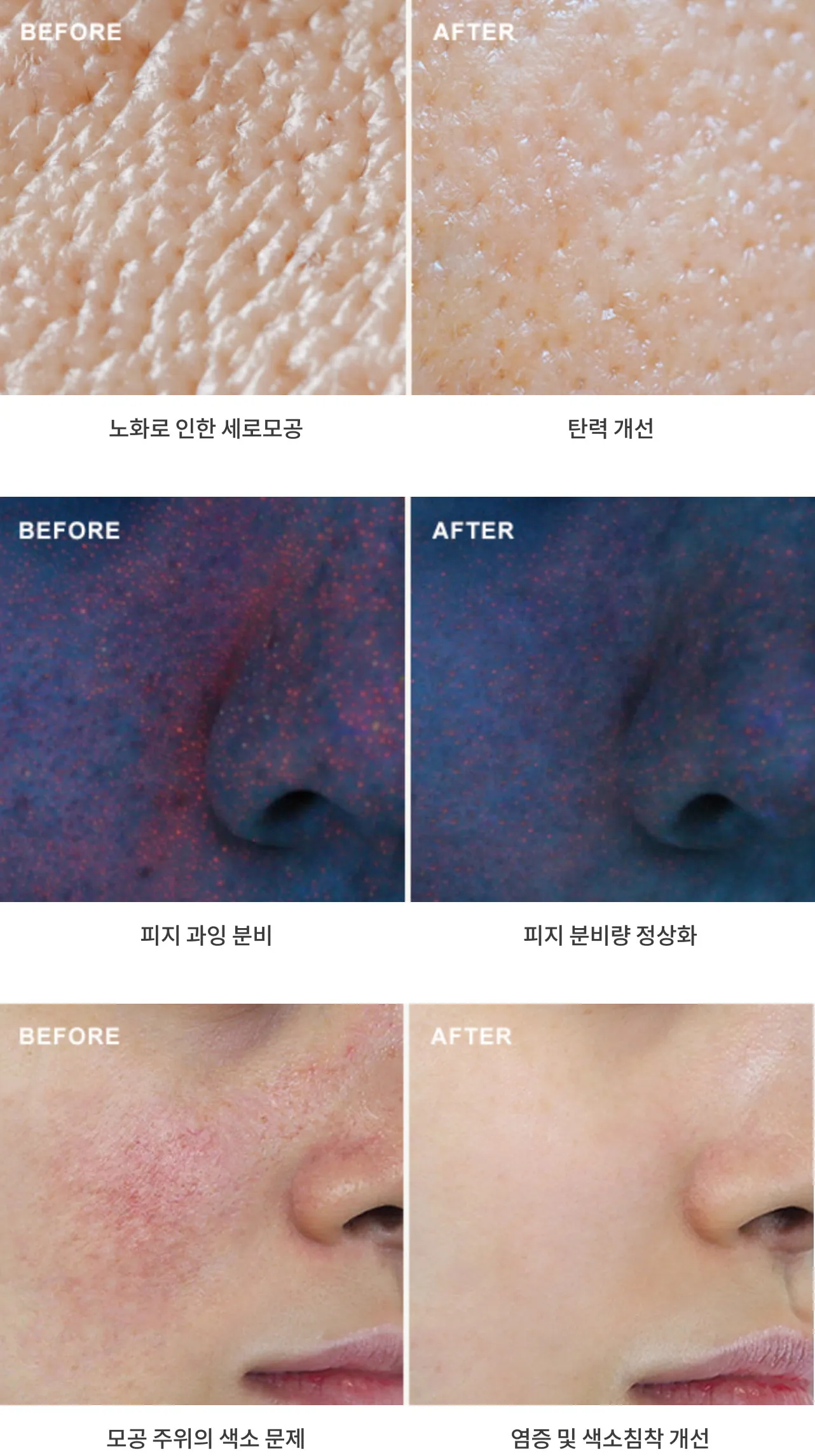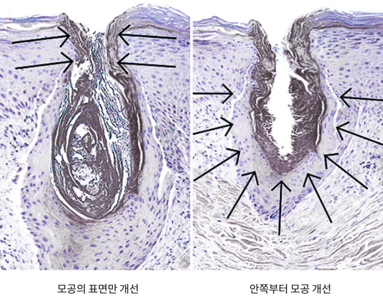 진피층에서의 콜라겐 재합성을 촉진시켜서 피부 속 모공 안쪽에서부터 모공이 메워지게 만드는 것입니다.