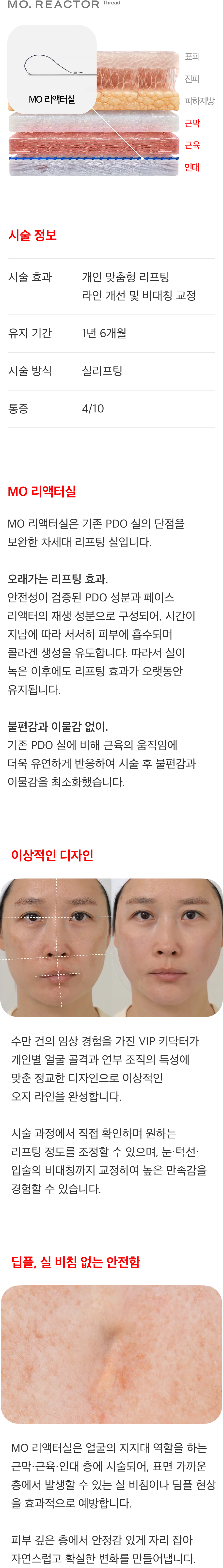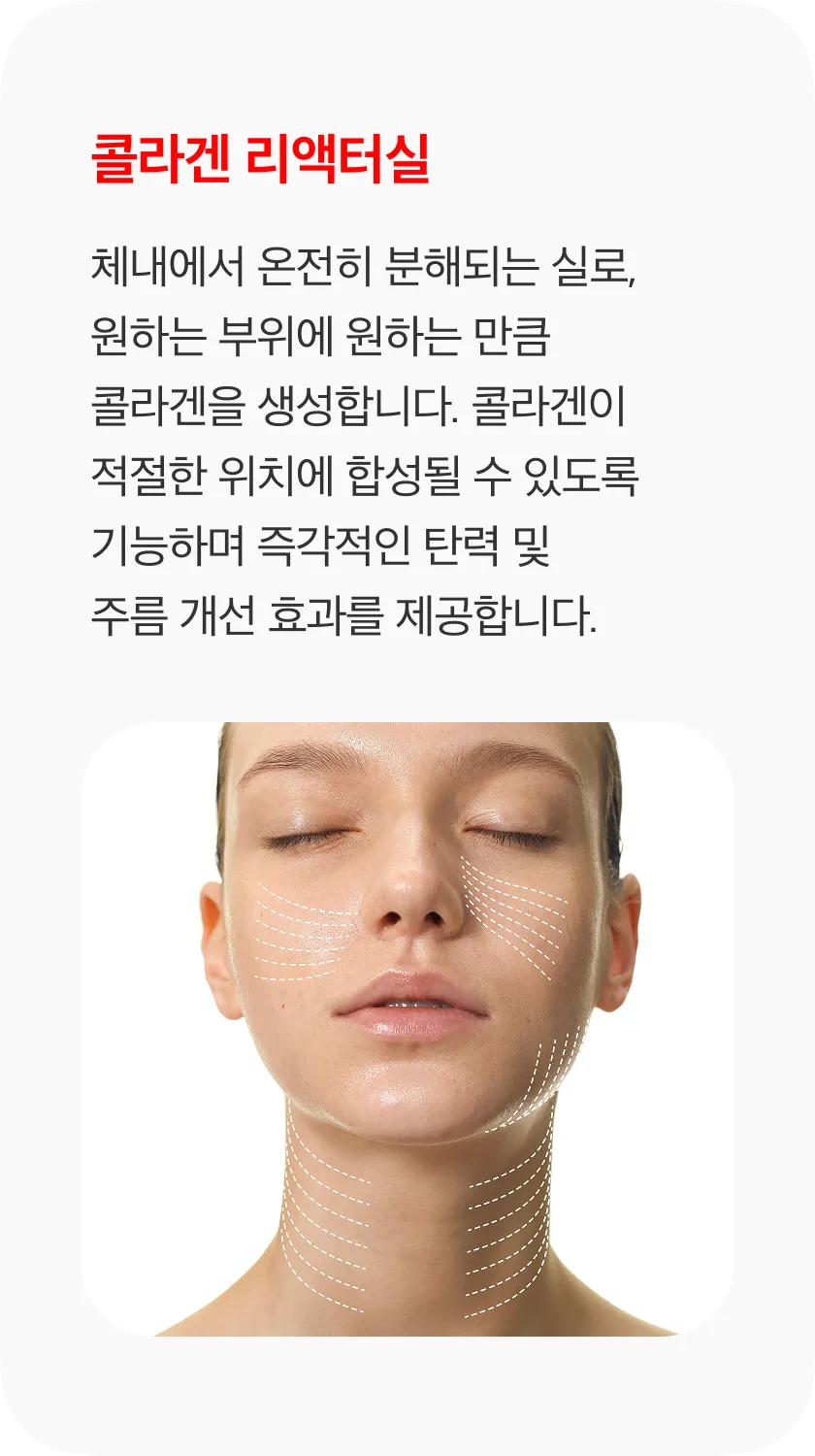 MO 리액터실 : MO 리액터실은 1년 6개월 이상 유지되는 리프팅 효과를 제공합니다. 특유의 재생 성분과 뛰어난 생체 적합성으로 기존 리프팅 실 대비 장기간 효과 지속력이 우수합니다.