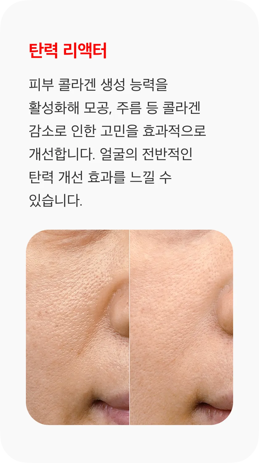 탄력 리액터 : 피부 콜라겐 생성 능력에 초점을 맞춰 얼굴 전반의 탄력 개선 효과를 위한 특화 리액터 시술입니다