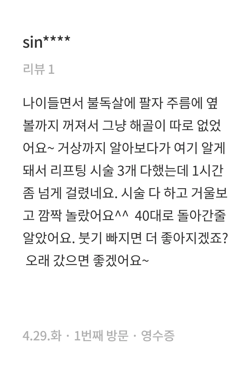 즉각적인 효과에 집중한 시술 구성으로, 1회로도 만족스러운 효과를 체감할 수 있습니다. 다만, 개인의 얼굴 구조와 피부 상태에 따라 달라질 수 있으므로, 전문가와의 충분한 상담을 통해 가장 이상적인 시술 계획을 제안받으시길 권장드립니다.