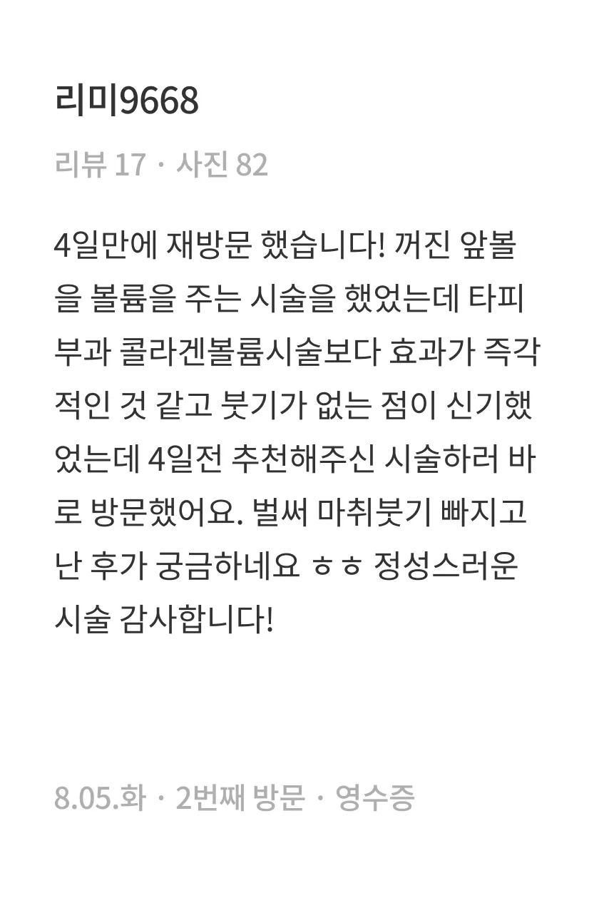일반적으로 시술 후 붓기는 2~5시간 이내로 사라지지만, 컨디션에 따라 다음날까지 붓기가 유지될 수 있습니다.