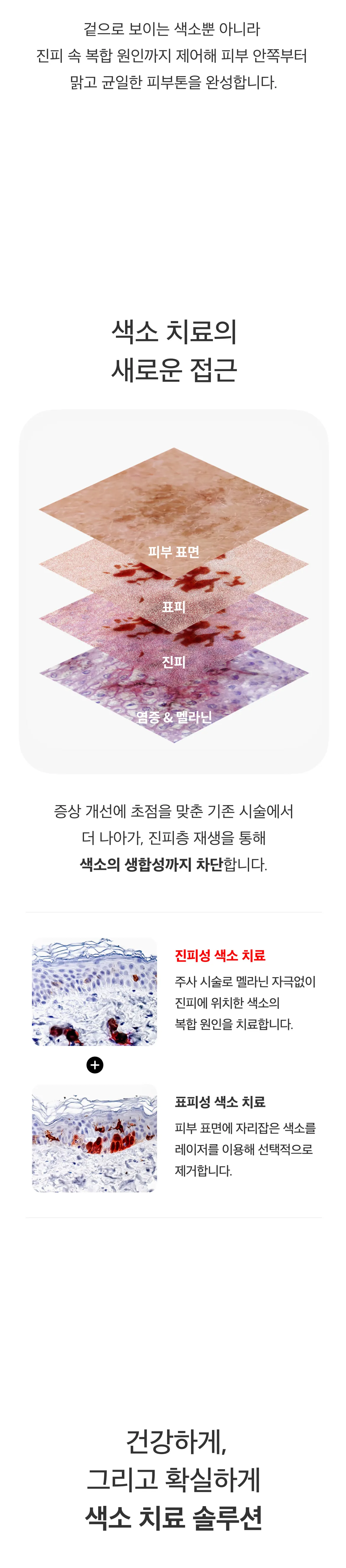 색소는 발현 위치에 따라 표피형, 진피형, 복합형으로 나뉘며, 한국인의 경우 2~4가지 유형이 복합적으로 나타나는 경우가 많습니다. 특히 깊은 부위에 자리한 색소는 치료에 시간이 걸리며, 근본 원인을 개선하지 않으면 재발할 수 있어 관리가 까다롭습니다. 메디컬오는 증상 완화는 물론, 근본 원인까지 개선하는 체계적인 접근으로 보다 확실한 치료 효과를 제공합니다.