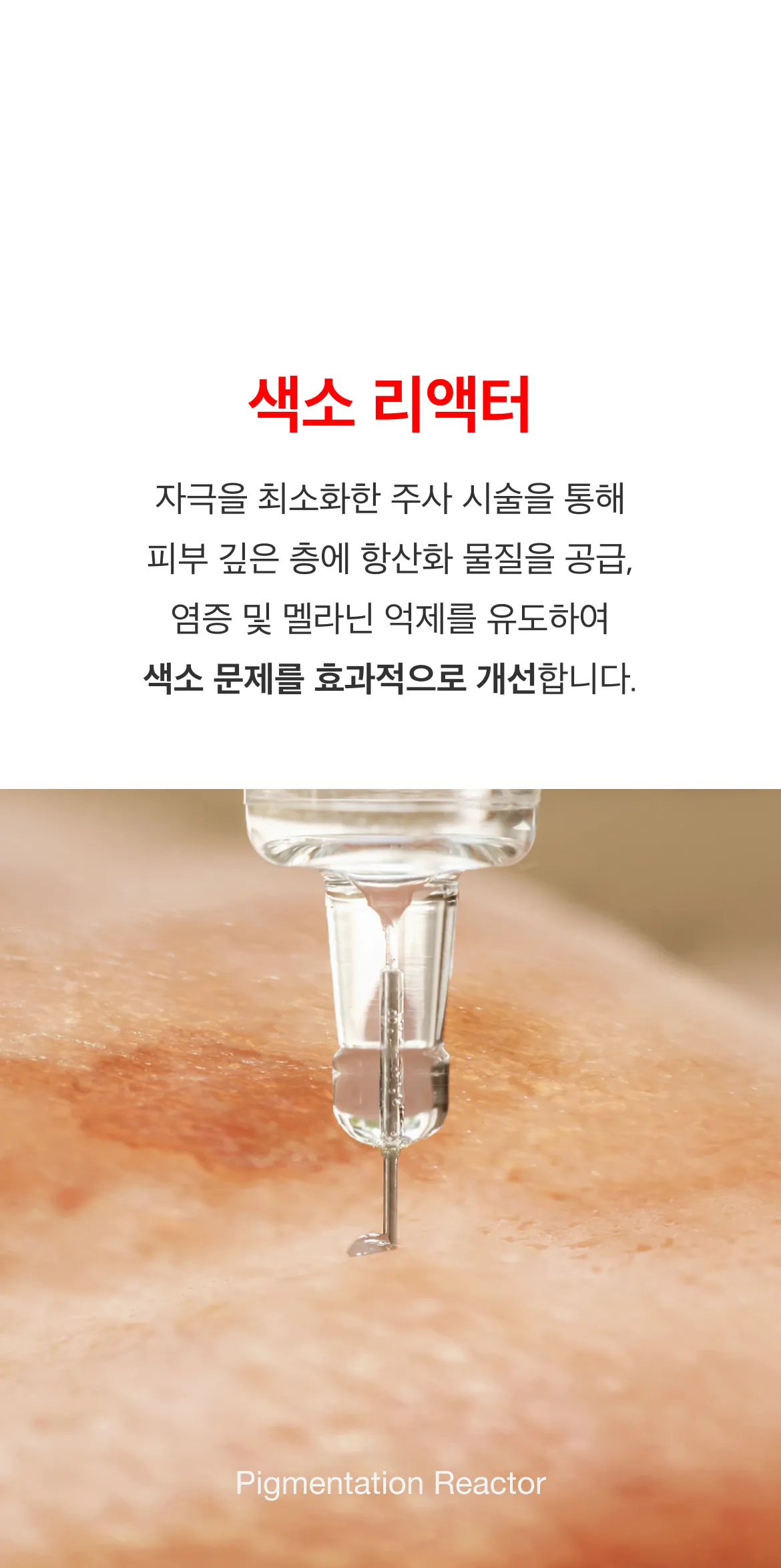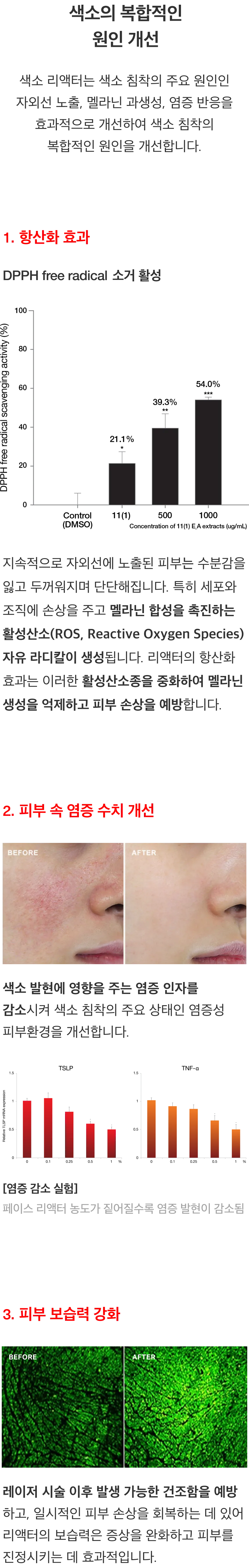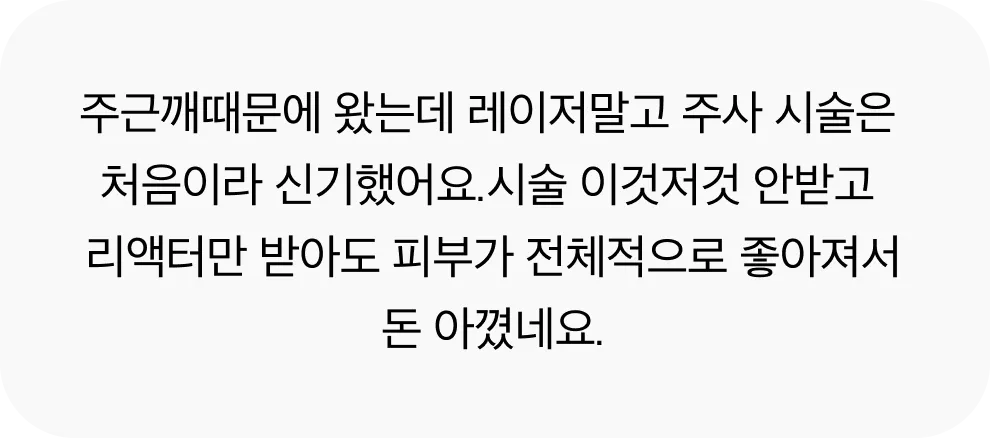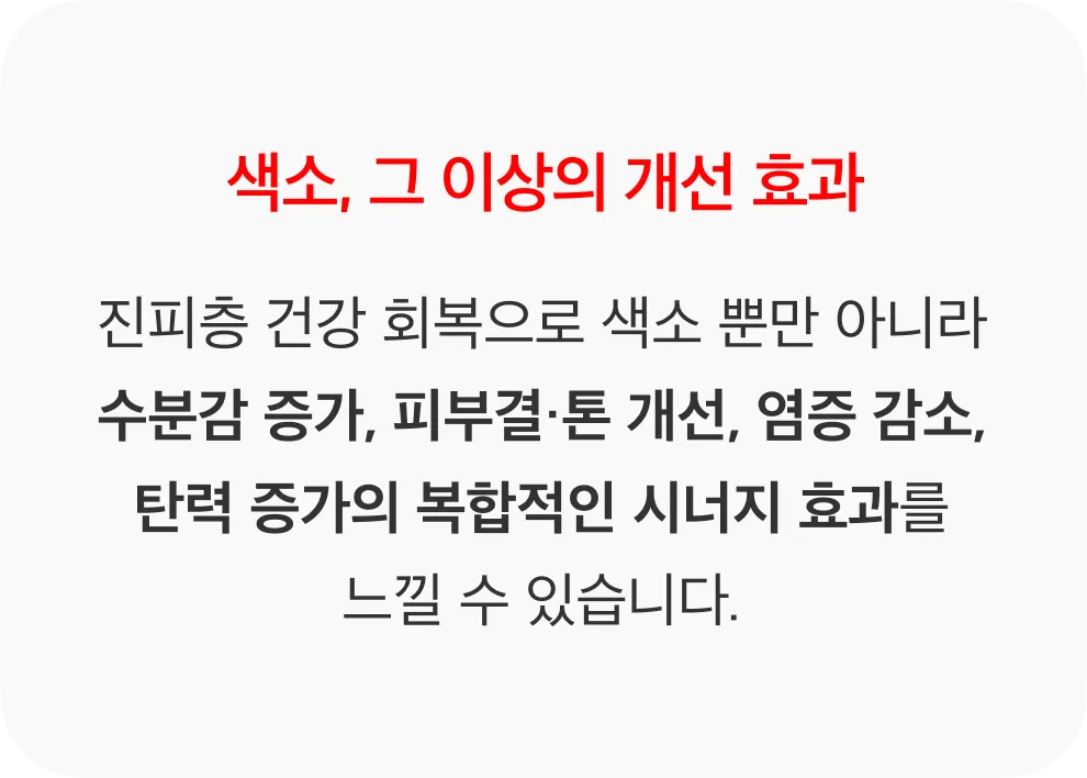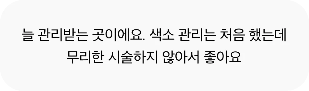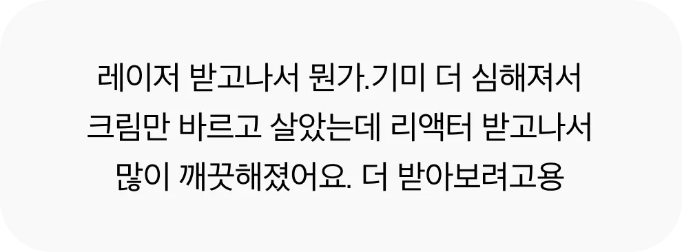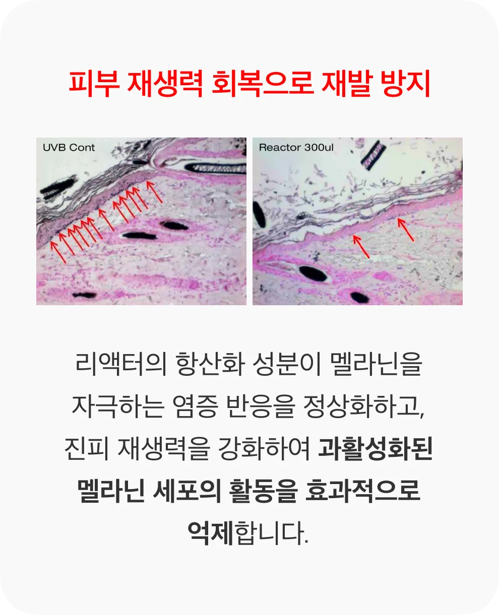 색소 리액터는 오직 천연 성분으로만 구성, 합성 화학 성분이 전혀 포함되지 않아 민감성 피부에도 적합하며 마셔도 무방할 정도의 높은 안전성을 자랑합니다. 또한, 수많은 시술 케이스를 토대로 안전성과 우수성을 인정받았습니다. 자극을 최소화하였기 때문에 반복적인 시술에도 안전하며, 디바이스 시술로 인한 피부 자극을 완화하여 부작용 걱정없이 시술 받으실 수 있습니다.