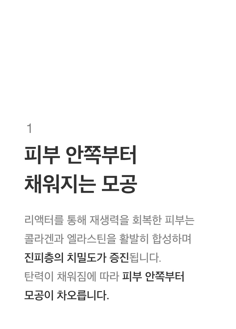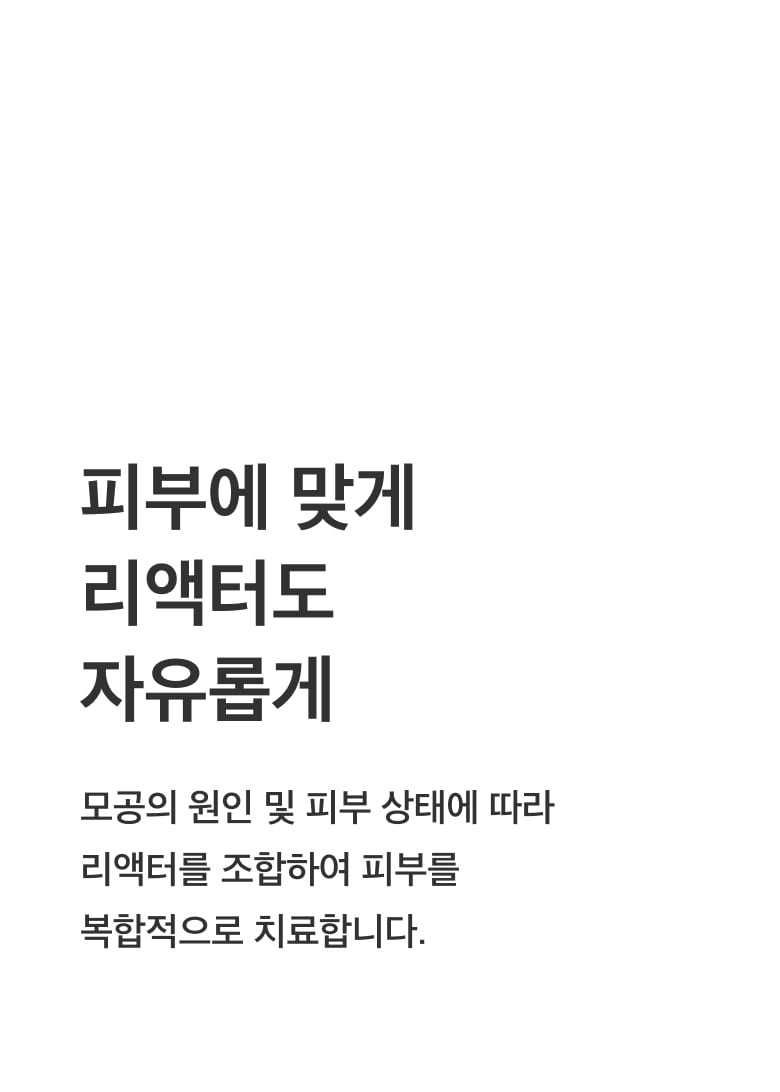 진단 과정을 통해 고객님의 피부 상태를 확인하고 개선이 필요한 요소를 분석합니다. 개인의 피부 상태에 따라 적절한 리액터를 조합하여 가장 건강한 상태의 피부로 회복시킵니다.
