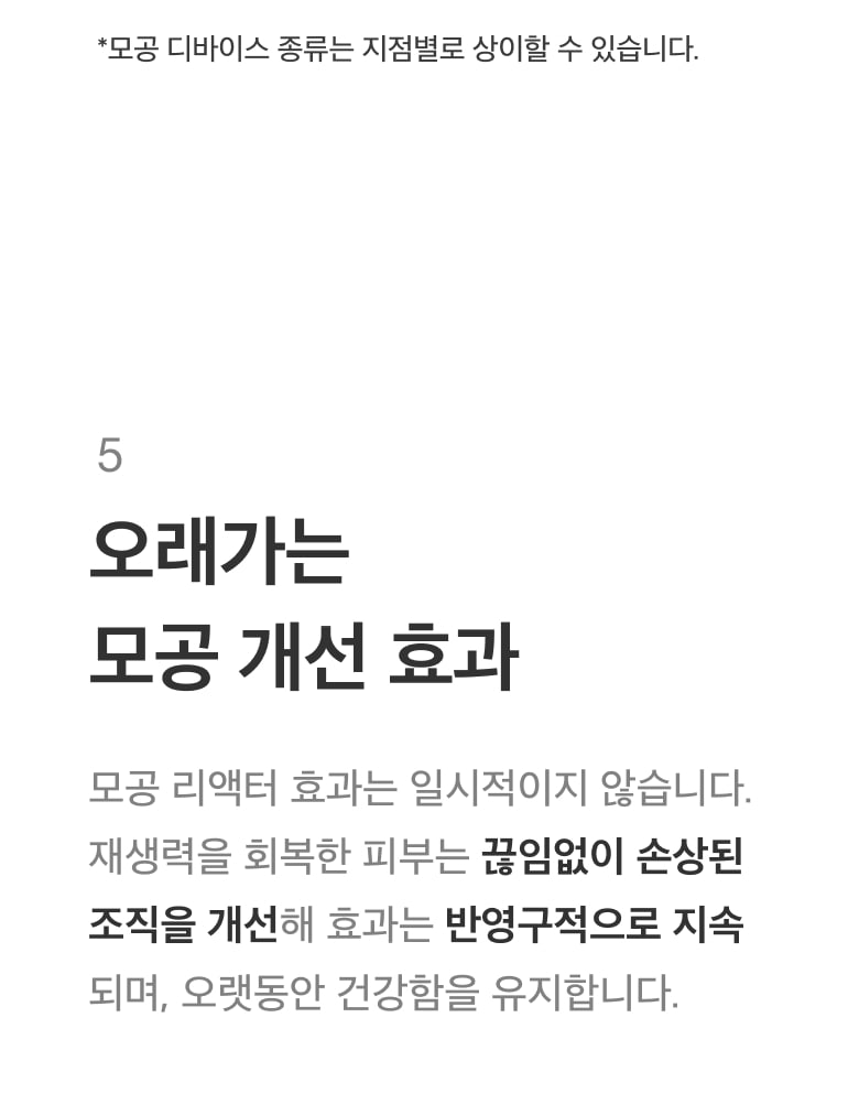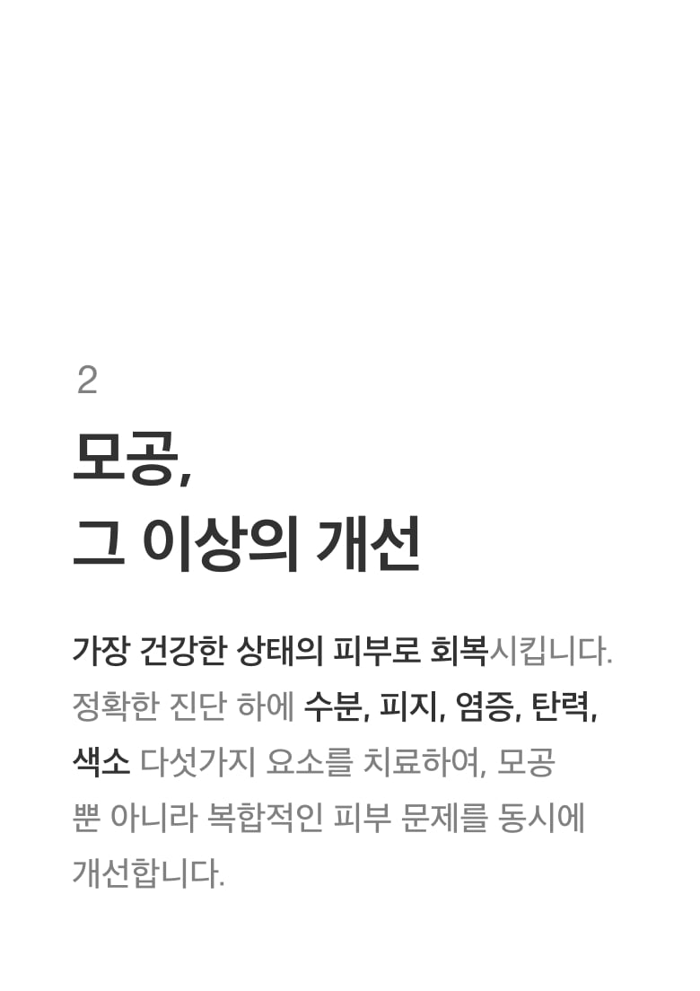 피부를 손상시키지 않아 부작용으로부터 안전하며, 피부 건강을 전반적으로 회복시키기 때문에 모공 외에도 잔주름과 피부 결이 개선되는 효과, 피부톤과 안색이 맑아지는 효과를 느끼실 수 있습니다. 모공 개선 프로그램은 고객님의 만족도가 가장 높은 시술 프로그램입니다.