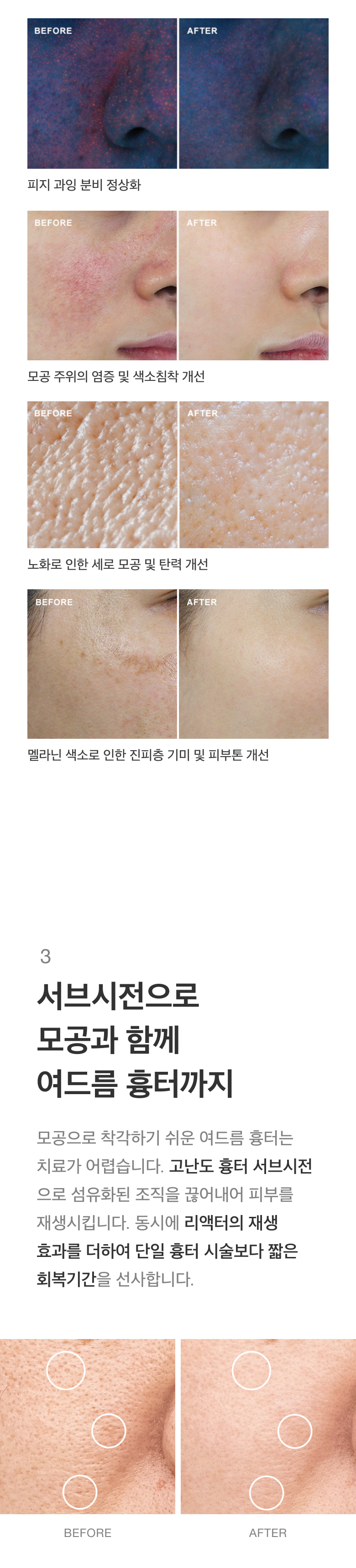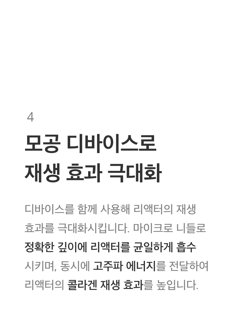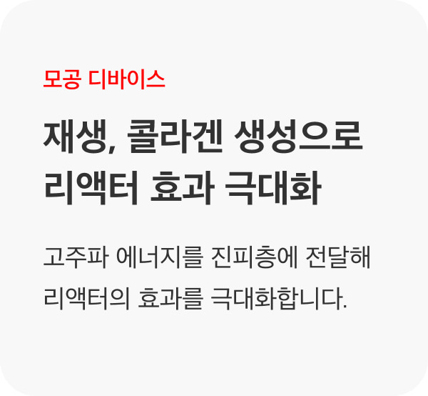 리액터는 피부 재생 능력을 활성화시켜 주기 때문에, 재생력 회복에 중점을 둔 타 시술과 병행할 경우 시너지 효과를 기대할 수 있습니다.